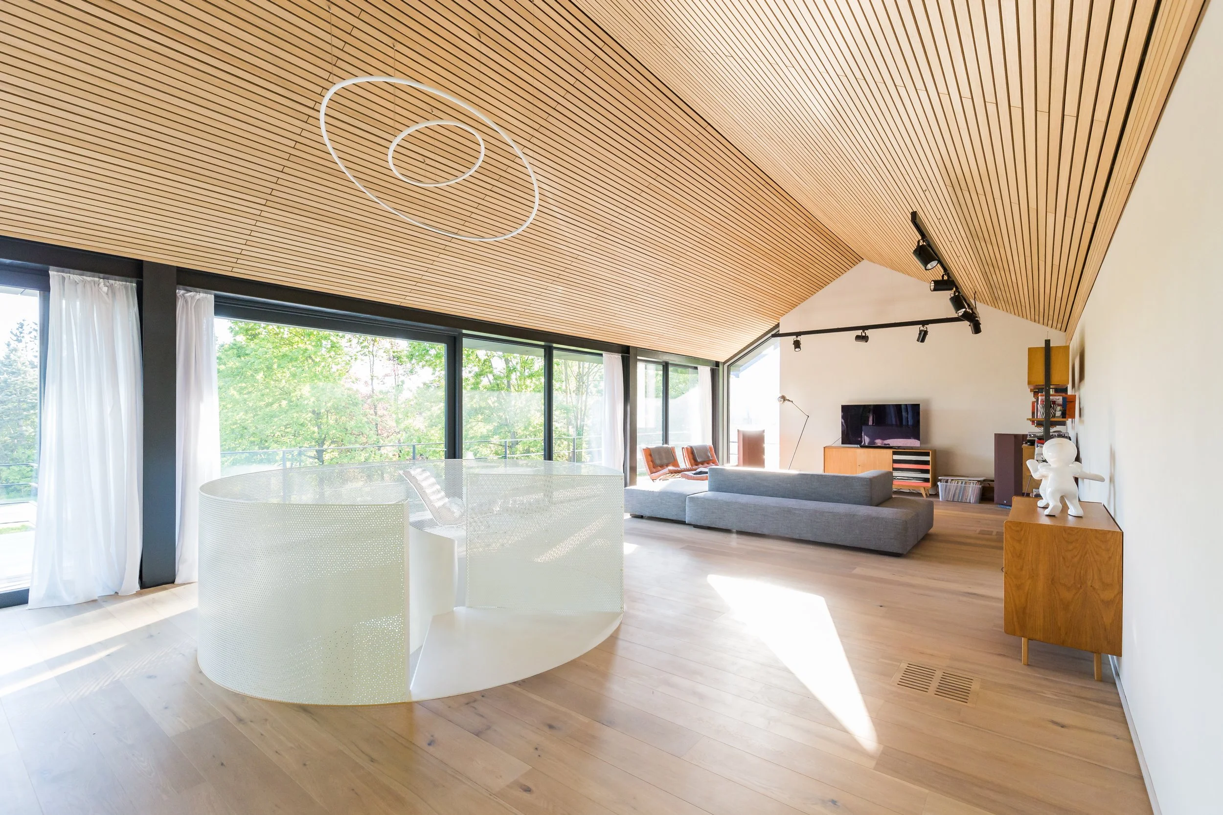 Habiter en parfaite harmonie avec une nature omniprésente, telle est l’essence de ce projet. Imaginez un bois de hêtres, un terrain vallonné et des rêves de cabanes perchées dans les arbres… Depuis le séjour, grâce aux vastes baies vitrées, vivre au cœur des arbres, en symbiose avec le paysage qui vous entoure.
